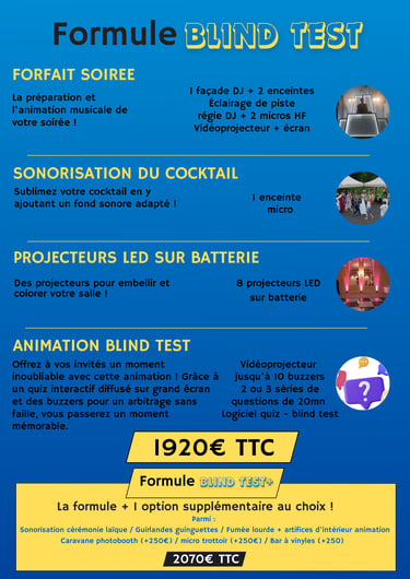 Vous pourrez personnaliser le quiz en choisissant Parmi des chansons ou des questions : Les invités pourront tester leurs connaissances sur une variété de sujets, des films aux sports en passant par la culture générale. Le tout dans une ambiance conviviale et détendue qui garantira une soirée réussie pour tous les participants !