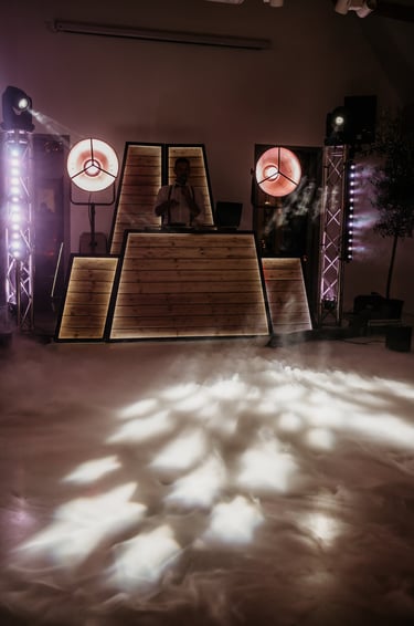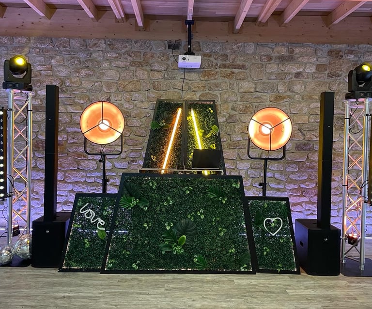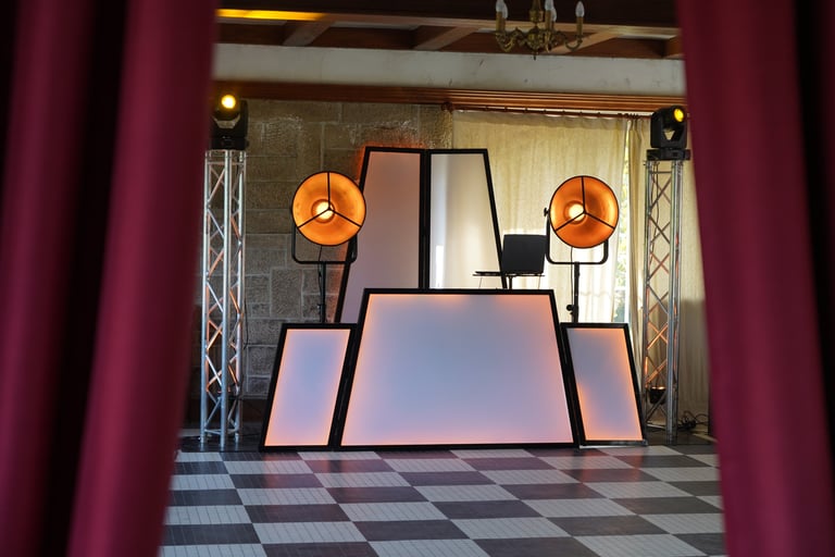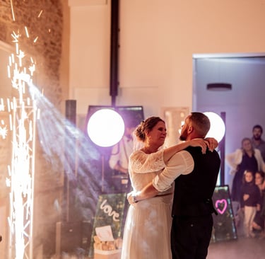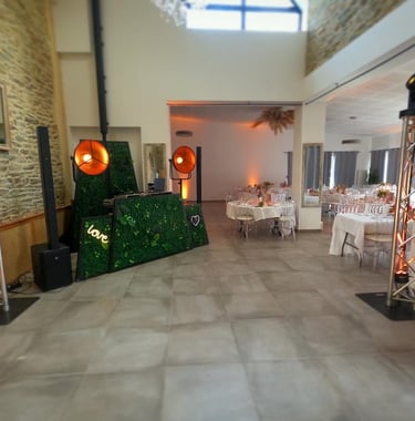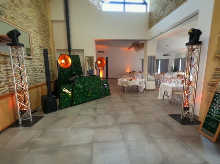 Nous vous proposons de mettre en lumière votre lieu de réception afin de donner un cachet visuel haut en couleur ! Nous disposons de 8 éclairages sur batterie que nous pilotons depuis notre régie afin de s'adapter à l'ambiance du moment : nous choisissons la couleur, l'intensité, le clignotement.. tout ce qu'il faut pour rendre votre lieu unique !